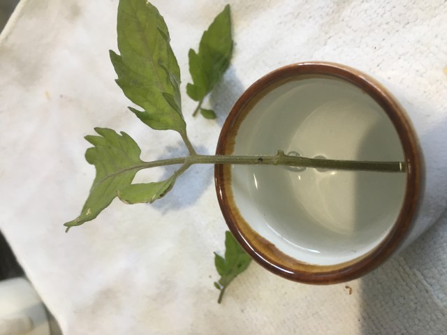 これがカットした部分です。ここから葉っぱを2枚落として水に差しておきました。こっから根っこが出てきてらいいなと思っておりました。